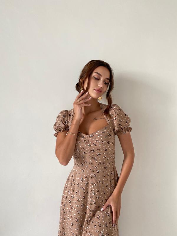 Бежева сукня з квітковим принтом Параметри моделі: 89-64-96 Зріст моделі: 177 На моделі розмір: S Матеріал: Штапель Довжина виробу: 110 см Довжина рукава: 25 см