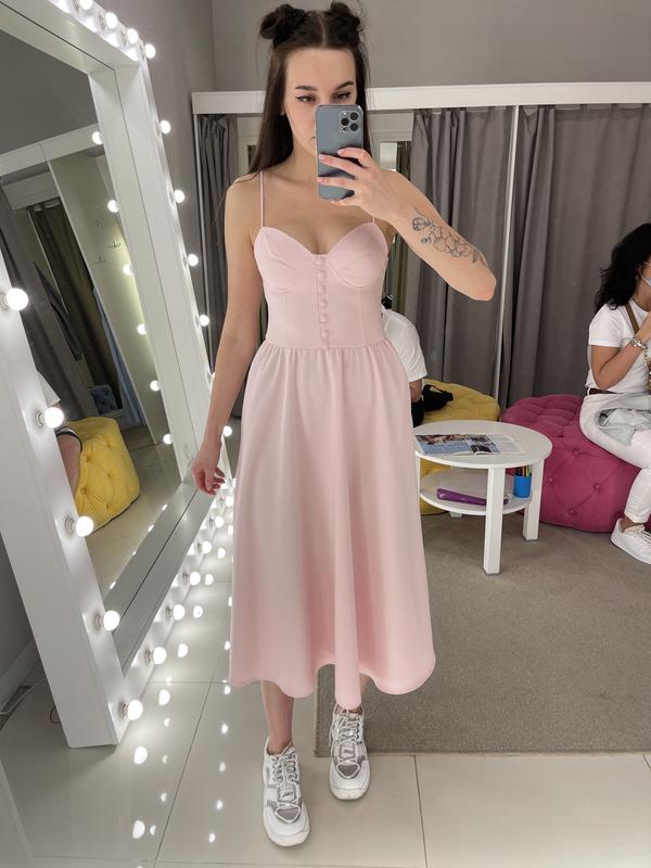 Сарафан новый, с биркой. Сарафан миди нежно-розового цвета. Имеет приталенный силуэт с отрезной линией талии, визуально подчеркивает хрупкость образа. Модель имеет тонкие бретели. Верхняя часть сарафана выполнена с имитацией корсета. Особенность модели - ряд декоративных пуговиц, обтянутых тканью. А, также, юбку-клеш со сборками на талии. Сарафан выполнен из костюмной ткани. Модель будет одинаково актуальна, как для повседневных образов, так и для праздничных.