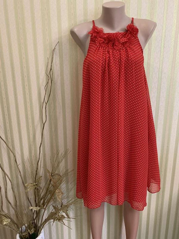 Состояние идеальное Красного цвета в белый горошек На груди отделка цветы На тоненьких бретельках Застегивается сзади на пуговицу Верх шифон На подкладке красного цвета Смотрится супер На рост 152-158 см Замеры Пог 42 Длина 88