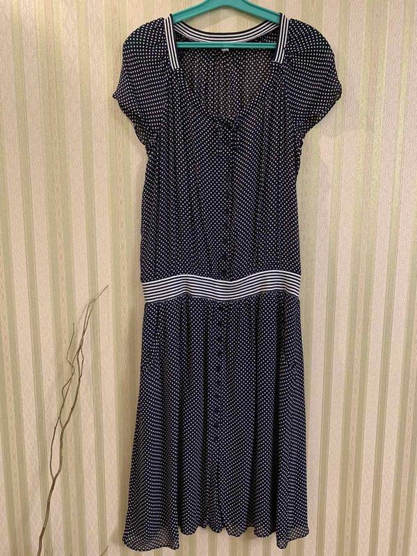 Стан ідеальний Темно синього кольору в горошок Спорт стиль Шифон До талії застібається на гудзики Талія на трикотажній резинці Є дві кишені Нижче талії на підкладці Виглядає супер Виміри Плечі спущені Рукав від горловини 22 Пог 54 Піт 37/47 Побіди 62 Довжина 115 Є запасна гудзик