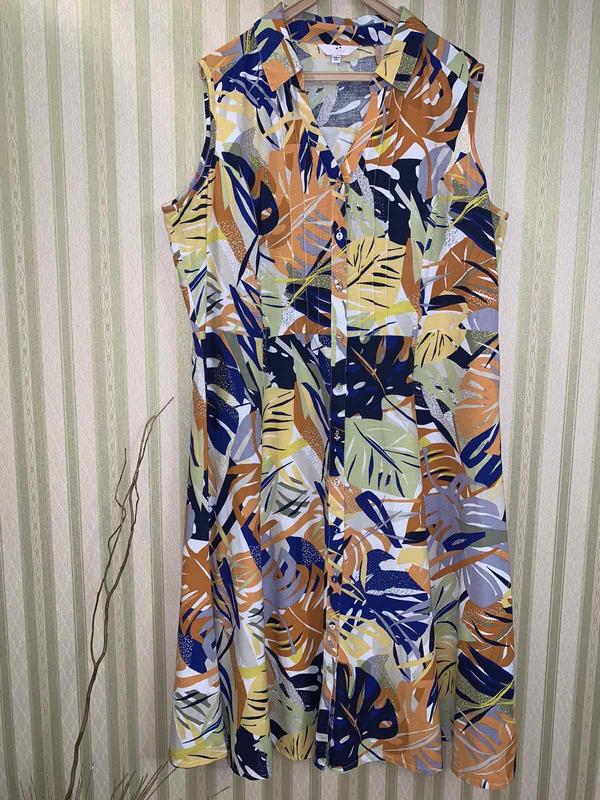 Состояние идеальное Индия 50% вискоза 35% Катон 15% лён Красивая расцветка Застегивается на пуговицы по всей длине От талии расклешенное Ткань приятная к телу и на ощупь Есть шлёвки для пояска Замеры Плечи 42 Пог 61 Пот 54 Поб 75 Длина 118