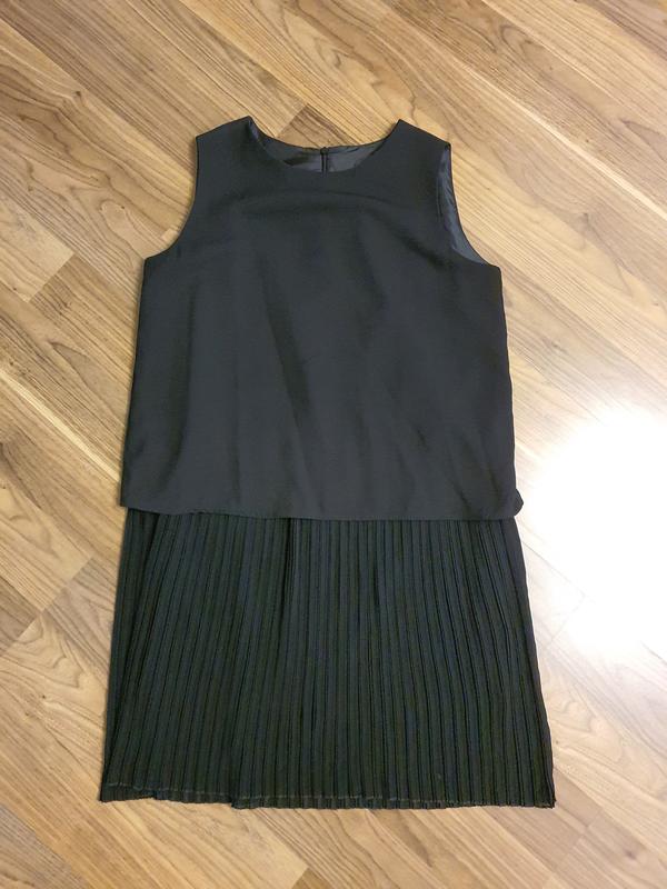 Летнее платье черного цвета. Прямого кроя. Юбка-плиссировка. Сзади на молнии. На подкладке. Без рукавов. Без дефектов. Замеры: Длина изделия 92 см. Плечи 36 см. Ширина бретели 8 см. ПОГ 50 см. ПОТ 50 см. Состав: 100% полиэстер. Оплата на карту приват банка и доставка новой почтой.