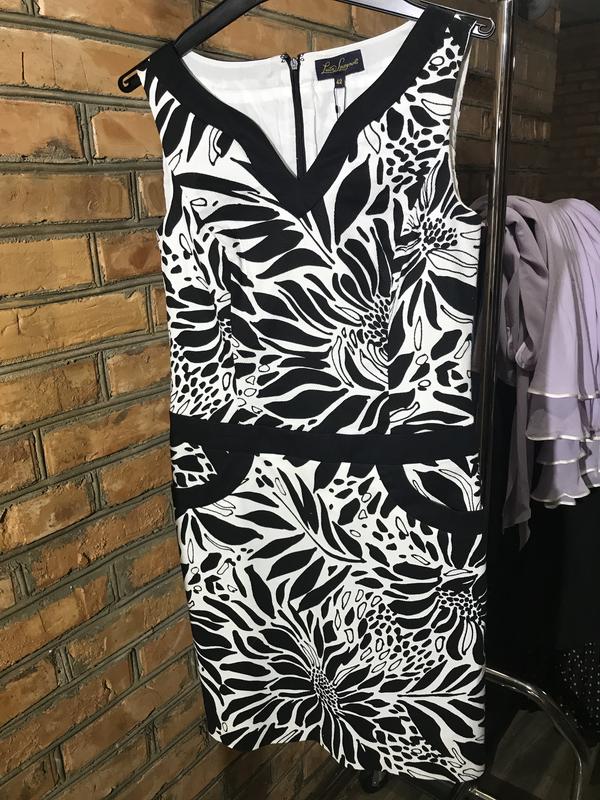 Платье без рукавов с принтом на белом фоне чёрные тропические листья. Вырез V образный. Отрезное по талии. Пояс из чёрной ткани. Юбка прямого кроя. Два накладных кармана с чёрным кантом. Сзади скрытая молния и крючок. На подкладке. Тонкое и прохладное. Очень приятное к телу. Шикарно облегает фигуру. Очень удобное в машину. Размеры: ПОГ 40 см ПОТ 39 см Длинна по спинке 92 см