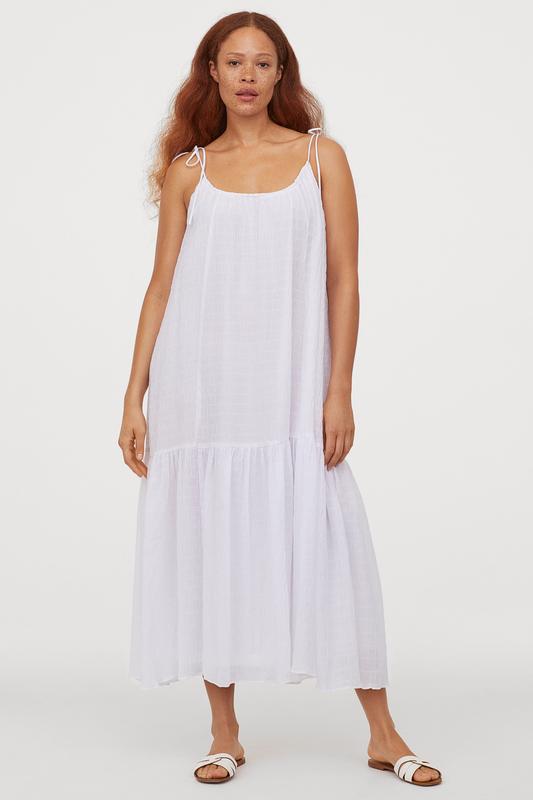 Объемное платье до щиколотки с текстурированной тканью из смеси лиоцелла Tencel ™ с жатым покрытием. Низкий вырез на спине, узкие бретели с завязками и присборенный шов по низу для дополнительной ширины. Подкладка не сьемная, джерси. Размер по бирке М, но сядет и на L, XL, так как очень свободное и в груди (ширина на уровне груди 60 см) и ниже. Состав: верхняя ткань: лиоцелл 68%, полиамид 25%, полиэстер 6%, эластан 1%, подкладка: полиэстер 100%. Платье белоснежное, новое, не ношено, но без бумажной этикетки - аутлет со склада бренда h&m от поставщика. Отвечу на инетресующие вопросы по товару. В реальности выглядит на много круче чем на фото!