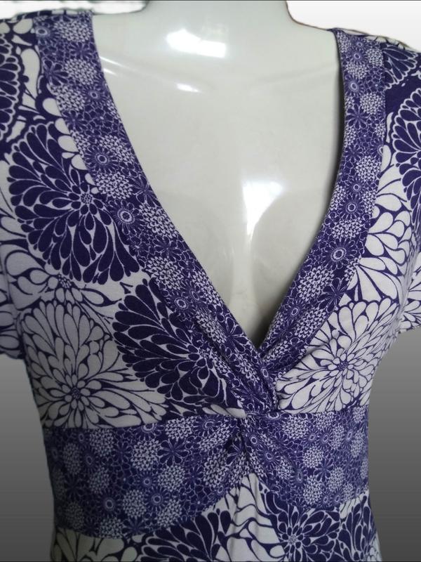 Качественное трикотажное миди платье Rocha John Rocha от DEBENHAMS расклешенное Полуприлегающий силуэт, расширяющийся книзу из-под груди. А-силуэт (трапеция). V - образный вырез горловины. Короткие рукавчики. Без подкладки. Платье выполнено из натуральной вискозы. Материал легок в уходе - машинная стирка, практически несминаем. Приятный материал, матовый. Хорошо тянется, облегает фигуру. Идеален для лета и переходных сезонов. Подойдет всем типам фигуры, вертикальные рельефы стройнят. V - образный вырез горловины визуально вытягивает шею и делает плечи уже. Глубокий вырез горловины отделан тканью-компаньоном в таких же тонах. В центре выреза планки отделки перекрещиваются и драпируются, создавая вставку под грудью Длина 103 см ПОГ 44 см ПОТ 38 см ПОБ 52 см Плечи по спинке 40 см Платье очень приятное, уютное, удобное. Принт: переплетающиеся сине-фиолетовые цветы денима с натуральными бежевыми. Состав: 96% вискоза 4% эластан Платье новое. Без бумажной бирки. Бренд-бирки на фото