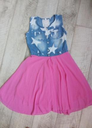 Продам красивое летнее платье для романтической девушки. Верх выполнен из легкого котона -джинса со звездным принтом. Карманы эмитированы под латки. Юбка воздушная из ткани типа шифон на подкладе. Застегивается на красивые пуговки в форме камушк. По спинке красивая прошва.