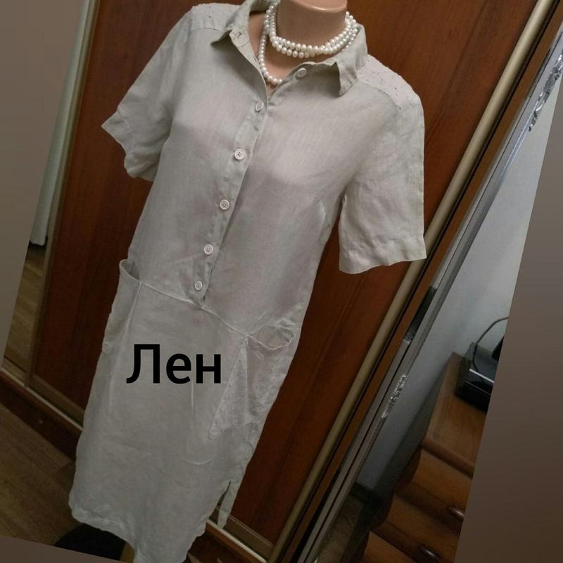 Шикарное платье из очень легкой льняной ткани, ткань тонкая очень, легкая, дышащая, качественная , на плечах и карманах выбит кружевной рисунок, цвет серо бежевый Ориентир по замерам дл 96 пл 41 рук 26 пог 48 пот 50 поб 54-55 по низ 56