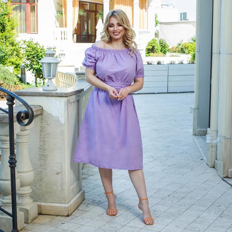 Платье Код 3476 Цена 1000 грн. Ткань: прошва 100% хлопок. Цвета: ✅ белый ✅ черный ✅ синий ✅ лиловый ✅ пудра Размеры: 48-50, 52-54, 56-58, 60-62, 64-66. Длина платья: 108, 109, 110, 111, 112 см. Длина рукава: 28, 28, 28, 29, 29 см. Обхват рукава: 46, 48, 50, 52, 54 см. Замеры готового изделия: 48-50 ОГ 108 ОТ 116 ОБ 126 52-54 ОГ 116 ОТ 124 ОБ 134 56-58 ОГ 124 ОТ 132 ОБ 142 60-62 ОГ 132 ОТ 140 ОБ 150 64-66 ОГ 140 ОТ 148 ОБ 158 Стильное и комфортное платье из прошвы, на подкладе (основа и подкладка из 100% хлопка, растяжимости нет). По вырезу горловины платье собрано на резинку, можно носить на плечах либо спускать с плеч, силуэт свободный, трапециевидный. Рукав длиной до локтя, низ собран на резинку. Пояс из основной ткани в комплекте. Носить можно с поясом и без него.