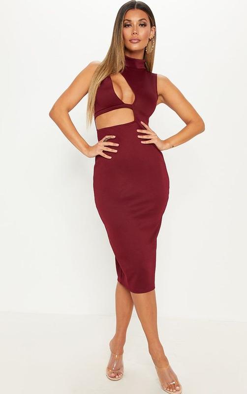 Соблазнительное платье-футляр с вырезом миди длины цвета марсала prettylittlething.новое