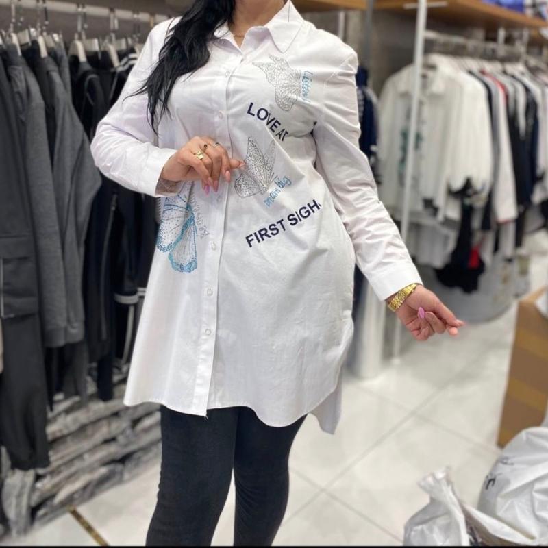 Любовь с первого взгляда- так переводится надпись.)) действует на противоположный пол-безотказно! Хлопковая стильная рубаха. Украшена стразами на ткани на пуговицах. длина рукава меняется , благодаря хлястику. представлена в четырёх размерах . замеры изделий : 46 размер-ОГ-116 см 48 размер-ОГ-120 см Длина передней полочки-85 см, длина спинки-99-100см.