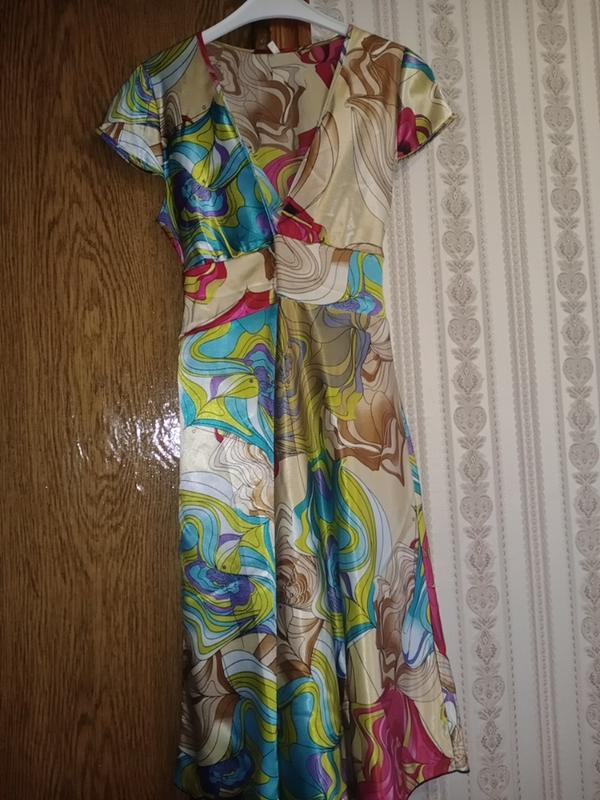 з атласного <матеріалу, на сонці переливається золотом, намагалась вловити камерою, але не виходить вживу виглядає дуже яскраво, але шляхетно довжина 98 пог 45 пот 42 поб вільно талія регулюється за допомогою пояса, що можна зав'язувати як спереду, так і ззаду