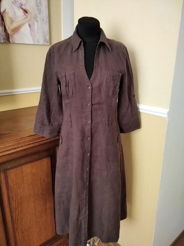 (ПЛ626)Сукня - халат, лён 100% Бренд Laura Ashley. В реальності колір насичений коричневий, однотонний(камера дає відблиски) Розмір вказаний 10/38. Заміри: плече 11см рукав 28-42см трансформер ширина по лінії плеча 38см ПОГ48см ПІТ 41см ПОБІДИ 53см довжина 109 см Відправлю Новою або Укрпоштою після повної оплати на мою мапу. Обміну та повернення немає.