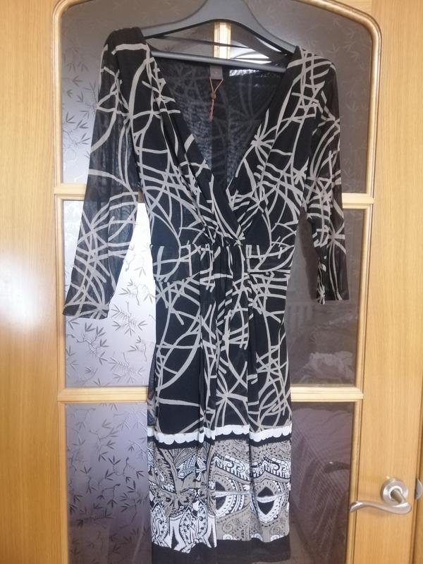 Трикотажное, качественное платье, от немецкого бренда S. Oliver, полностью на подкладе (кроме рукавов). С поясом на талии и эффектный декольте. Очень красивый принт. Трикотаж "сеточкой", но благодаря двухслойности не просвечивает.