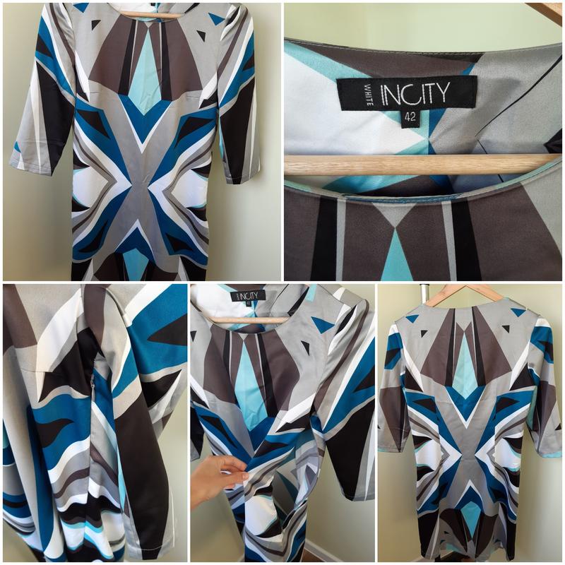 Новое платье с ярким геометрическим абстрактным рисунком. Сдержанные цвета, легкая струящаяся ткань. Рукав 3/4, сбоку есть потайная молния. Платье не тянется.