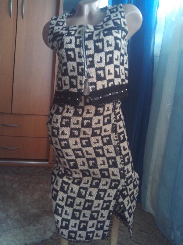 Девочки, шикарнейший фирменный теплющий костюм, состоит из жилеточки и юбки-миди. Жилеточка спереди на функционирующей металлической молнии и + на груди металлические маленькие молнии-украшения, низ жилетки украшен чёрной вставкой с аппликацией из кожи с заклёпками и маленькой тесьмой, точно такая же тесьма украшает спереди и подол юбки, спереди сбоку на ножке шлица ( разрез ). Смотрится оочень круто и стильно! Размер указан 38, наш 42, замеры жилетки: длина от плеча 44 см, плечи 34 см, ПОГ 42 см; замеры юбки: длина 63 см вместе с поясом ( ширина пояса 6 см, разрез 25 см ), ПОГ 33 см, ПОБ 42 см ( ОБ макс. до 88 см ), сбоку замочек. Ткань, состав: 65% полиэстер, 35% вискоза, НЕ тянется, НО, оочень теплющая! Бренд - Раris ofspring. Спрашивайте, пожалуйста, оочень классный, стильный, тёплый и эффектный; на холодную осень-весну, зиму - в самый раз! Б\у, НО, в отличном состоянии! Доставка УП или НП;-)...