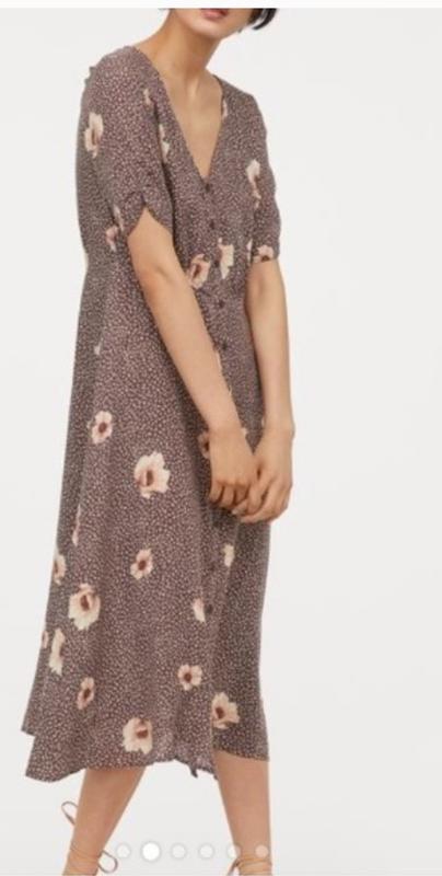 Нежное платье на пуговицах кофейного цвета в цветочный принт. Плечи - 3 ПОГ - 54см По линии кокетки - 45см ПОБ - 55см Длина платья - 123см Длина рукава - 29см