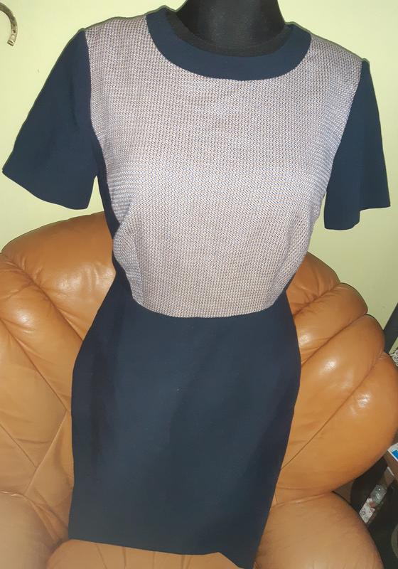 Синя класична сукня M&S р40 77%поліестр 17%віскоза 6%еластан ззаду замочок є підкладка стан відмінний груди 51см талія 41см бедра 51см плечі 41см рукав 20см