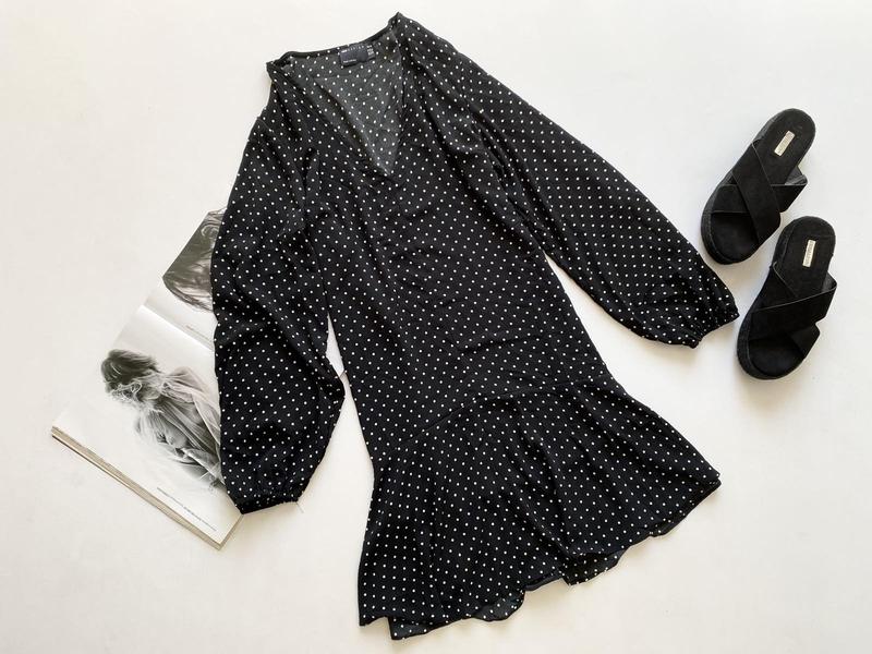 красивое легкое платье черное белый горох свободный крой 16 ххл глубокий вырез длина 89 см плечи 42 рукав 62 пог 54 пот 55 поб 56 низ 58 волан состав 97 полиэстер. 3 эластан