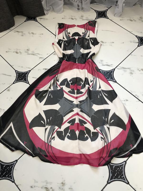 Ошатне плаття в цікавий контрастний принт, розмір 10/38, підійде на S. Виміри вироби: ПОГ 38 см, ПОТ 35 см, довжина виробу 104 см