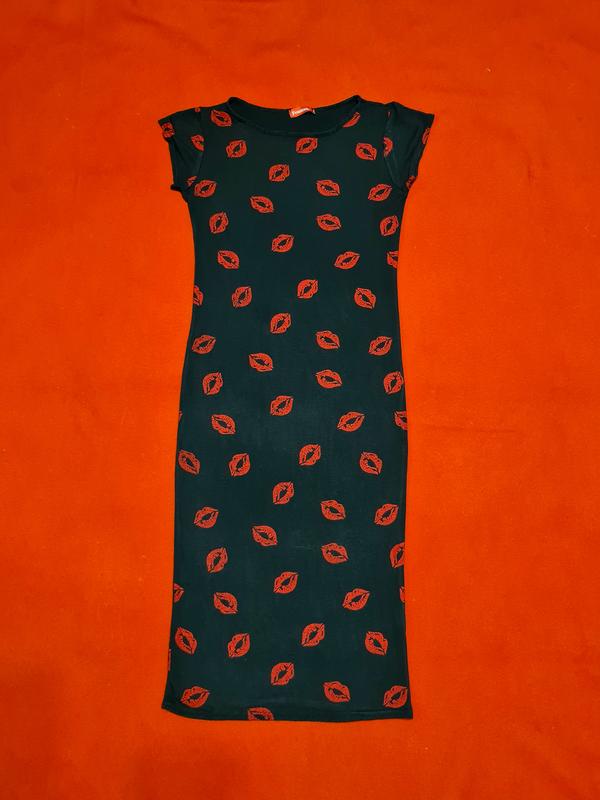 Облегающее платье миди в поцелуях. Размер M, длина 110, ОГ 82, ОТ 72, ОБ 78. Состав: 95% вискоза, 5% эластан. Состояние просто хорошее.
