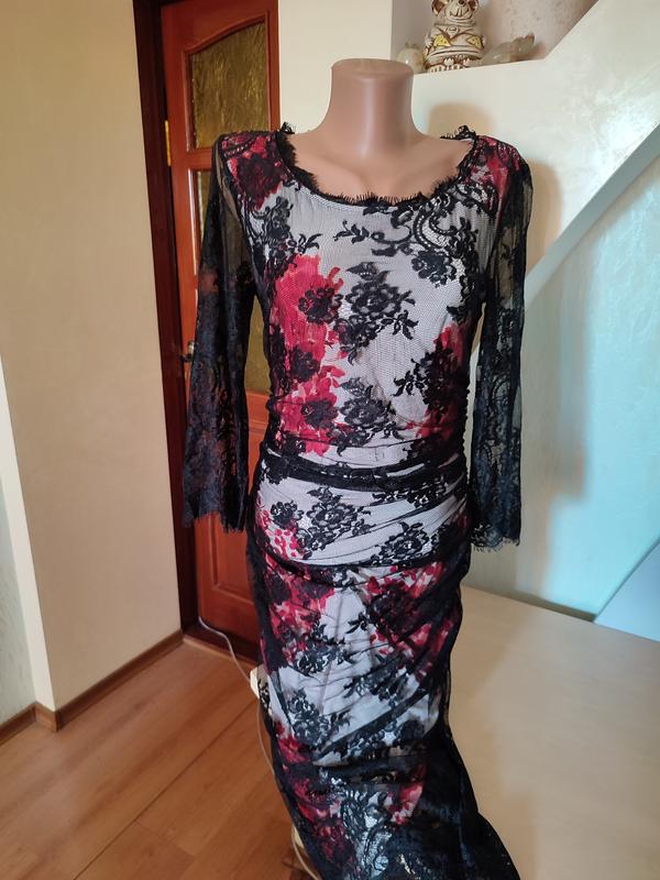 нижнее платье в цветочный принт, верх черный кружевной, рукав 3/4