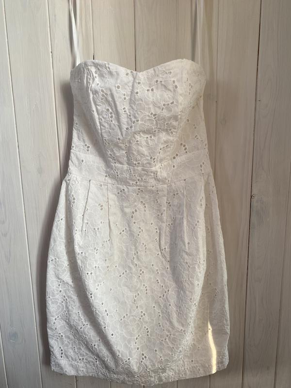 Платье бюстье , хлопковое с подкладкой. На бюсте есть силиконовая лента, хороше держится. Есть две точки пятнышка, еле заметные, на фото 3-4. Пог 40 см Пот 33 см Поб 49 см Длина 68 см Размер указан 36 eur