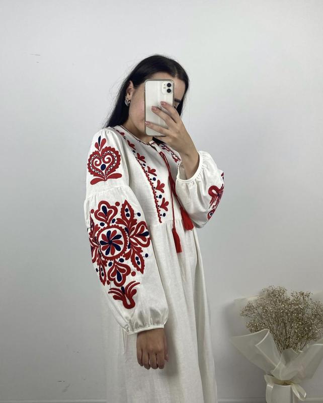 Етнічі речі завжди в моді. Плаття з 100% бавовни, грубий бавовна, машинна вишивка комірець і довгий рукав з рослинним геометричним орнаментом-вишивкою. Рукав знизу зібраний. Виріб має дві довгі зав'язки, які затягують комірець. кольори: чорний, білий, синій Розмір єдиний-універсальний. ... Блуза - довжина 60, рукав від горловини 64, пог 52 ... Плаття міні {85 см} ПОГ 46 см, плечі 38 див.,пояс 43 см ...Плаття міді {115 см} ПОГ 46 см, плечі 38 див.,пояс 43 см ♦️додаткові фото по кожній моделі пришлю в приват♦️