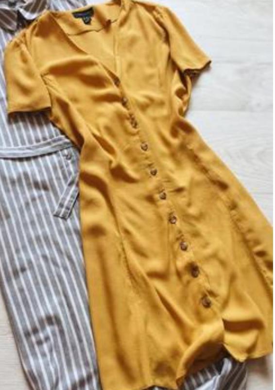 Платье на пуговицах горчичного цвета, без нюансов Полуобъем груди 48 см Полуобъем талии 42см Длина 88 см Плечи 39 см