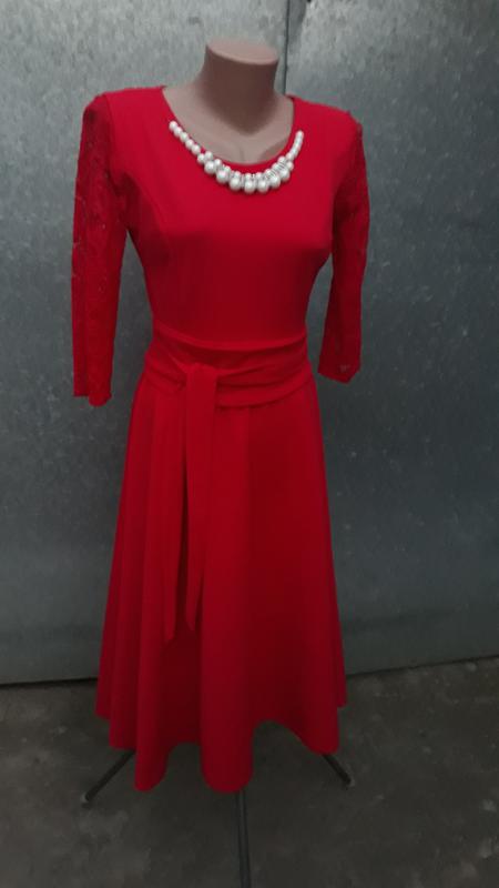 Шикарне плаття 48 розміру червоного кольору. Стан нового, було одягнуте один раз в ресторан. Тканина креп дайвинг, рукав 3/4, стрейч гіпюр. В комплекті пояс. Юбка - півсонце. Декор на шиї - імітація жемчугу діаметром 8мм