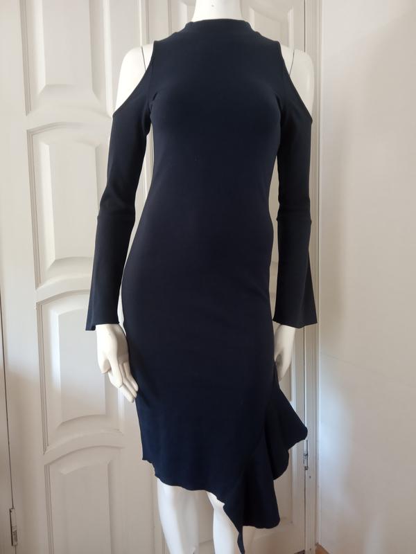 Великолепное платье глубокого темно-синего цвета с длинным рукавом и вырезом на плечах.Очень интересное разделение, с одной стороны оформлен воланом.Рукав внизу расширяется,ворот полубойка.Без застежек,чужно облегает фигуру.Размер XS(наш 42-44).Фирма NA-KD.