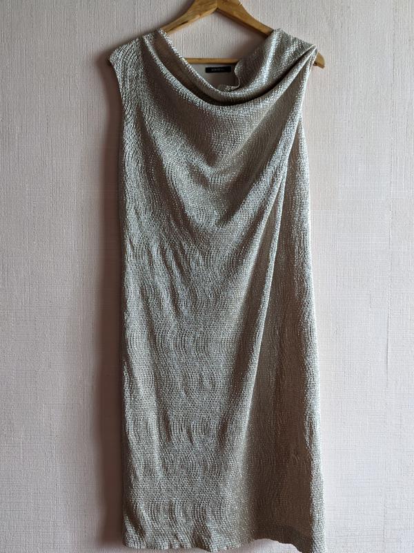 Платье с золотистым напылением.В идеальном состоянии.Горловина водопад,красиво выкладывается на груди. Прямого силуэта. Есть подкладка.красиво смотрится под пиджак Ткань немного тянется.Замеры Длина 107 см пог55 см пот 50 см поб 50 см Отправка Новой почтой по полной предоплате на карту ПриватБанка.Цена указана без торга. Возврат не предусмотрен.