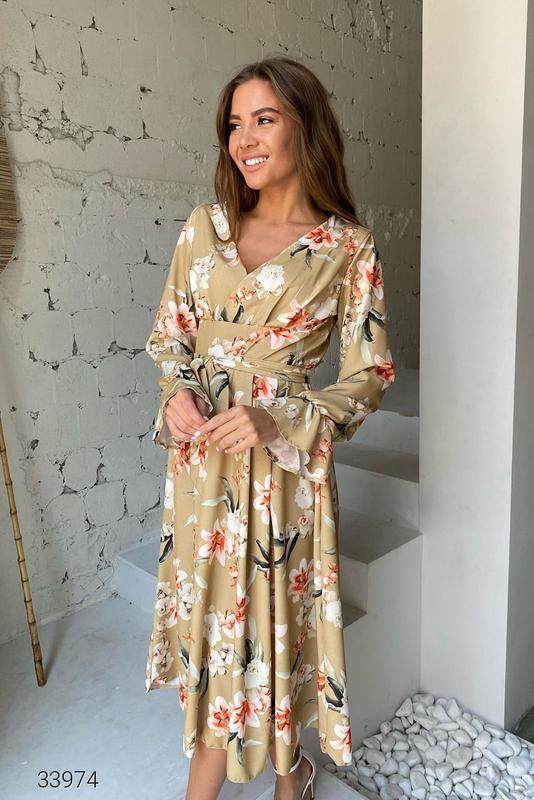 Платье с имитацией запаха из качественного софта. Рукава с фиксирующей резинкой, боковые прорезные карманы. Сзади застёжка на потайную молнию, в комплекте пояс