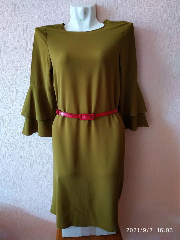 Платье цвета хаки, свободного кроя, можно носить под пояс. Застёгивается на пуговицу на спине. Длинна 92 см, пог 44см, пот 45см, поб 50см. Продается без пояса. Без дефектов, состояние нового.