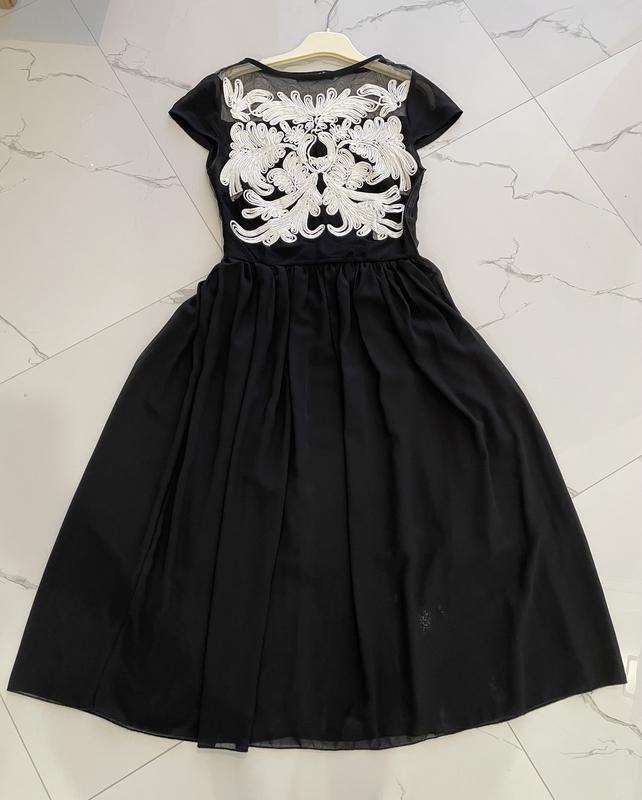 Красивое и нарядное платье, верх вышивка нитью на сетке , юбка шифон. С боку потайной замок Замеры : Плечи 33 см По линии груди 39 см Талия 30 см Бёдра свободно Длина 108 см
