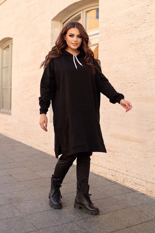 Платье-туника Арт 5558 Цена 670 грн Материал: трехнить-петля, турецкая, хлопковая. Плотная , слабая растяжимость. Длина 97 см, по бокам разрезы. Капюшон. Длина рукава 61 см. Замеры по изделию: ОГи ОБ 135 см . Стиль оверсайз Размер универсальный 46-64