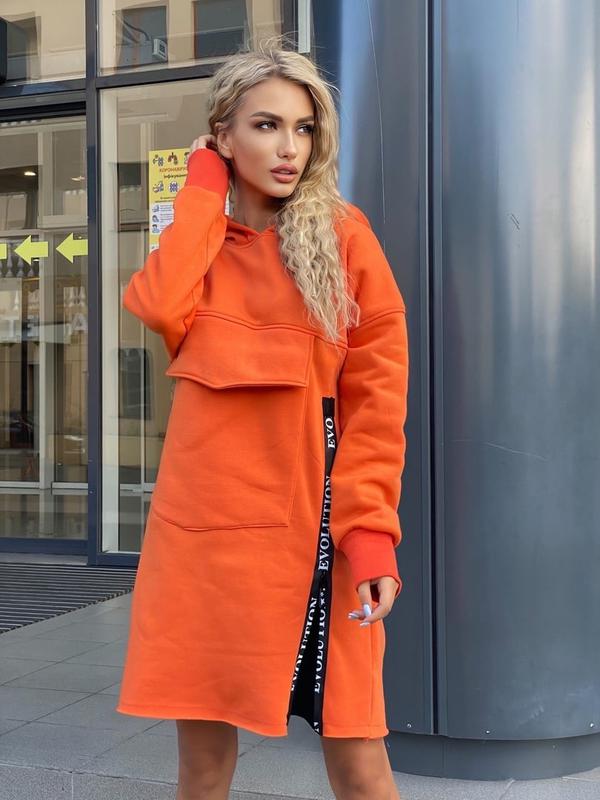 Сукня тепле арт. tas. 236 Розміри: 42-44, 46-48 Тканина: трехнить на флісі Колір: пудра, оливка, помаранчевий, сірий Теплу сукню з капюшоном і з великою кишенею