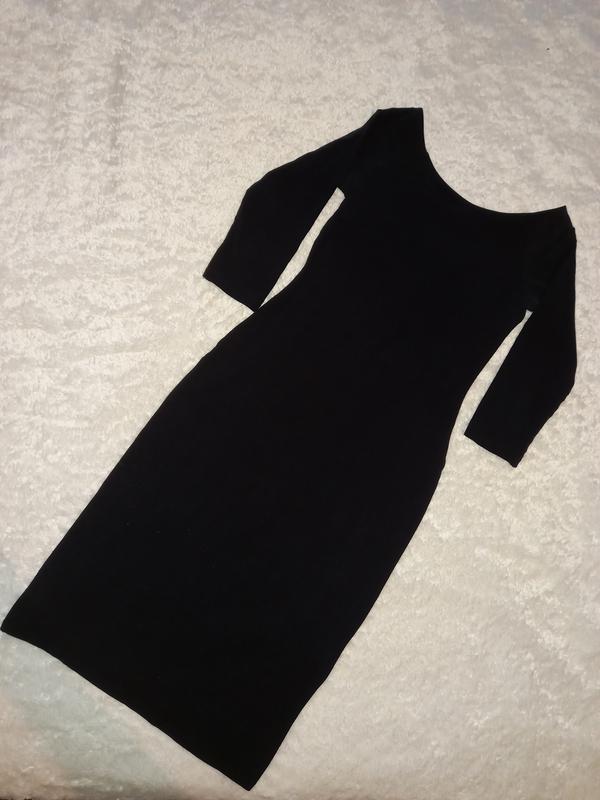 Трикотажное платье, хорошо тянется, размер М, подойдёт на L и XL. Сзади на спинке вырез на пару см больше, чем спереди, спинка красивая приоткрытая. Рукав 3/4. Замеры на фото.