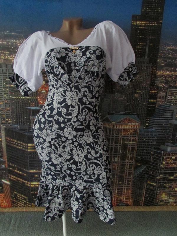 Красивое комбинированное платье с декольте, рукавчиками-фонариками, на них сборка-вырез с нежным кружевом и на манжетах, на груди украшено золотистой-украской-бантиком, юбочка внизу с воланом, на спинке не заметная молния. Выглядит дууже кокетливо и женственно подчеркивает фигурку. Размер указанного М, АЛЕ, маломерит, наш 42-44, замеры: длина от плеча 88 см, ОГ до 86 см, ОТ до 70 см, ОБ до 88-90 см, рукав сверху от горловины 33 см, по низу 21 см. Смешанный состав ткани: хлопок+ стрейч со вставками хлопка, отлично тянется! Спрашивайте, пожалуйста, дууже классное, красивое и качественное платье! Доставка УП или НП;-)...