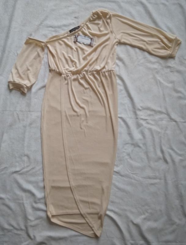 В талии резинка., юбка на запах. На одном плече рукав спущен. Пот 34-46.,поб 40-48,пог 48,длина 109.ткань тянется. Ткань видно на последнем фото.
