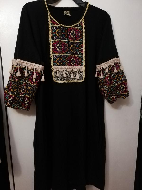 Трапецією пошито, хлопок, гарні рукава, є дві кишені, скриє всі недоліки. Довжина 88,плечі 40,, ширина під руками 53см, бедра вільно!!