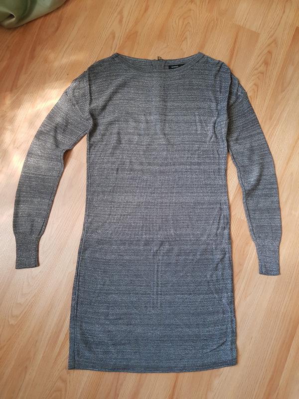 Вязанное платье с лёгкой серебристой нитью, очень мягкое, уютное, стильное и нарядное. Длина по средине спинки 87 см, молния 17 см, подмышки 47 см, талия 41 см, бедра 44 см, низ 45 см, плечи опущены, рукав от горловины 72 см, манжет 9 см.