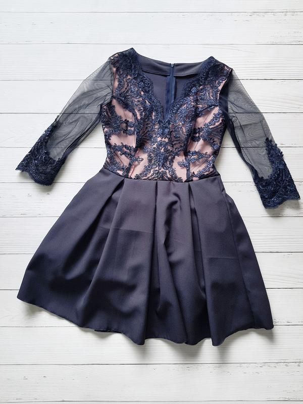 Нарядное платье темно-синее с кружевом и пышной юбкой Размер 46(L). (Фото реальные, сделанные нами)