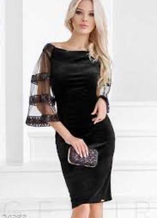 Оригинальное платье. Модель полуприталенного кроя длиной ниже колен прекрасно облагораживает фигуру, подчеркивая наилучшие ее стороны. Широкое декольте, открытые плечи привносят в образ нотки соблазнительности. Расширенный к низу длинный рукав из прозрачной сетки, делает воздушным и нежным силуэт.