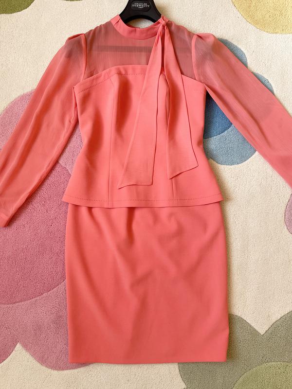 Платье украинского производства Джей Эль. В идеальном состоянии. Подойдет на размер М. Платье на подкладке, цвет - светлый коралл. На отрезной кокетке, оригинальный комбинированный фасон. Шарфик съёмный: можно по-разному завязать на шее, можно снять и использовать отдельно. Платье элегантное, оригинальное, добротное и красивое. Замеры: Длина - 102 см ПОГ -46 см Длина рукава от плеча - 63 см Длина рукава из подмышки - 48 см Спинка - 37 см ПОТ - 38-39 см ПОБ - 50 см