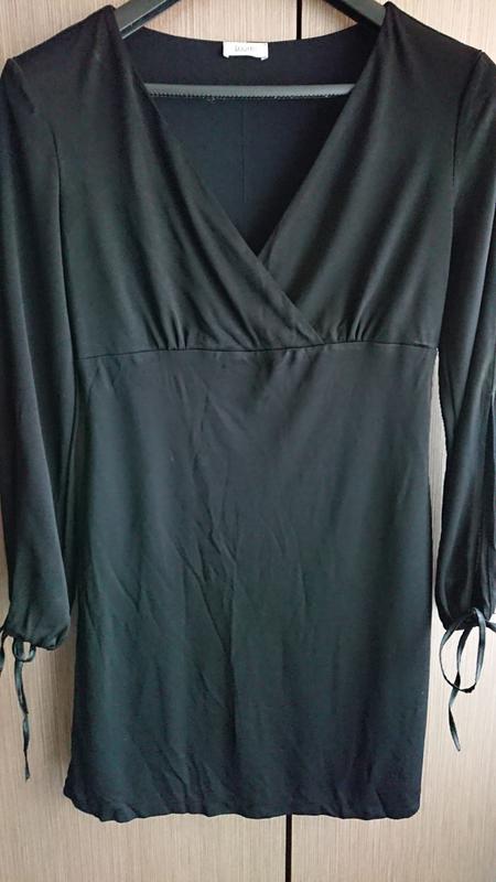 Чёрное платье из плотного трикотажа. Отрезное по линии талии. Впереди вырез на запах. Рукав внизу на завязках. Размер М или L. Талия завышенная. Замеры Пот 40 Длина по спинке 86 Длина рукава 60