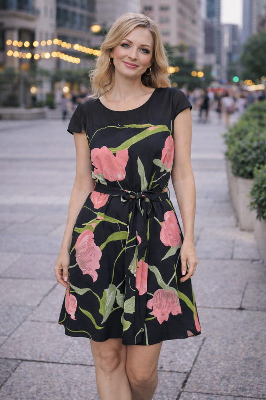 Нежное и красивое платье в принт с тюльпанами. Плечики тонкий шифон. Остальное платье натуральная ткань. Не тянетсяю На спинке уговка и замочек. Есть поясок. ОГ 88 см ОТ 72 см ОБ 136 см Длина 101 см