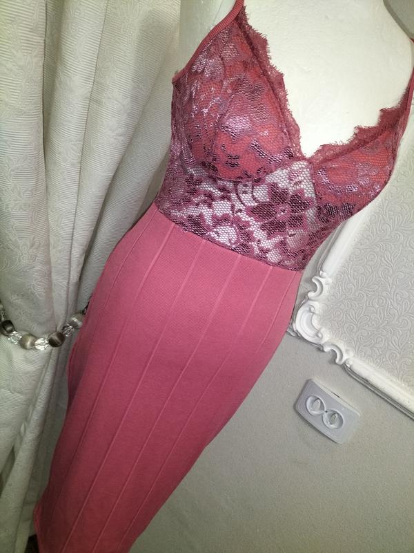 Платье по фигурке на тоненьких бретелях с кружевным верхом-лифом, юбка из плотного трикотажа, похожего на резинку. Хорошо тянется. Длина по спинке 85 см.