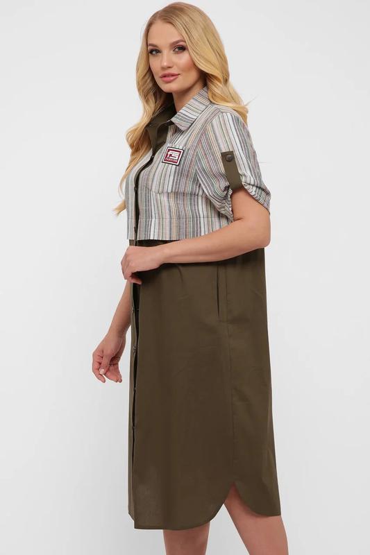 Платье-рубашка из двух видов ткани. Модель с полуотлетной верхней частью из коттон-джинс и по переду и по спинке. Воротник стойка, стояче-отложной. Планка центра притачная. Карманы в боковых швах, и фигурный нагрудный карман слева с нашивкой (пайетка). Рукав до локтя с хлястиком. Низ рубашки в боках фигурный, закругленный. Стойка, планка, хлястик, юбка полочки и спинки с однотонной х/б ткани. Верх полочки и спинки, рукав, воротник из отделочной ткани. Застежка до низу - кнопка. Размеры 52, 54, 56, 58 Ткань - хлопок+ коттон -джинс. Цвет: серый, оливка, синий Размер ОГ ОТ ОБ Длина рукава Длина изделия 52 116 112 120 30 110 54 120 116 124 30 110 56 124 120 128 30 111 58 128 124 132 30 111 Отправка в день заказа до 16:00 ! Оплата 100% на карту или наложенный платеж, оплата ******, расчётный счёт. Наши отзывы ************************************ Инстаграм @************* ***** **********, звонить ********** Шоурум Киев, Шепелева, 6 (по записи)