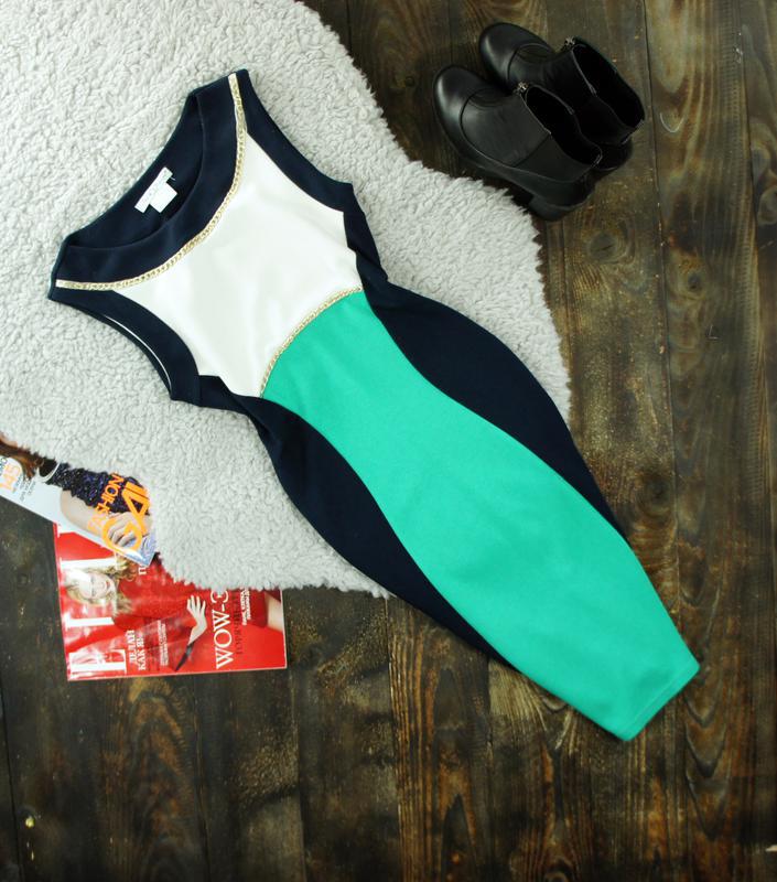 длина 95 пог 43-50 пот 32-40 поб 42-50 вискоза полиэстер эластан Сядет в облипку Отличное сочетание цветов Украшено золотой цепочкой За счет расцветки значительно вытягивает силуэт, стройнит