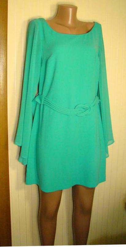 Нарядное платье туника с длинным широким рукавом. С плетенным поясом. Размер 46 (М). Ширина по груди 47 см. Ширина по талии 42,5 см. Ширина по бёдрам 48 см. Длина рукава 62 см. Ширина рукава внизу 44 см. Длина от плеча 88 см.